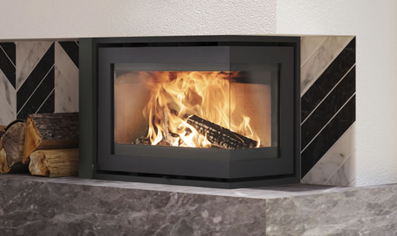 Insert acier d’angle, combustion sur sole foyère, une seule manette de réglage d’air, cadre fixe de 20 mm, vitre à droite ou vitre à gauche. Puissance de 6,7 kW